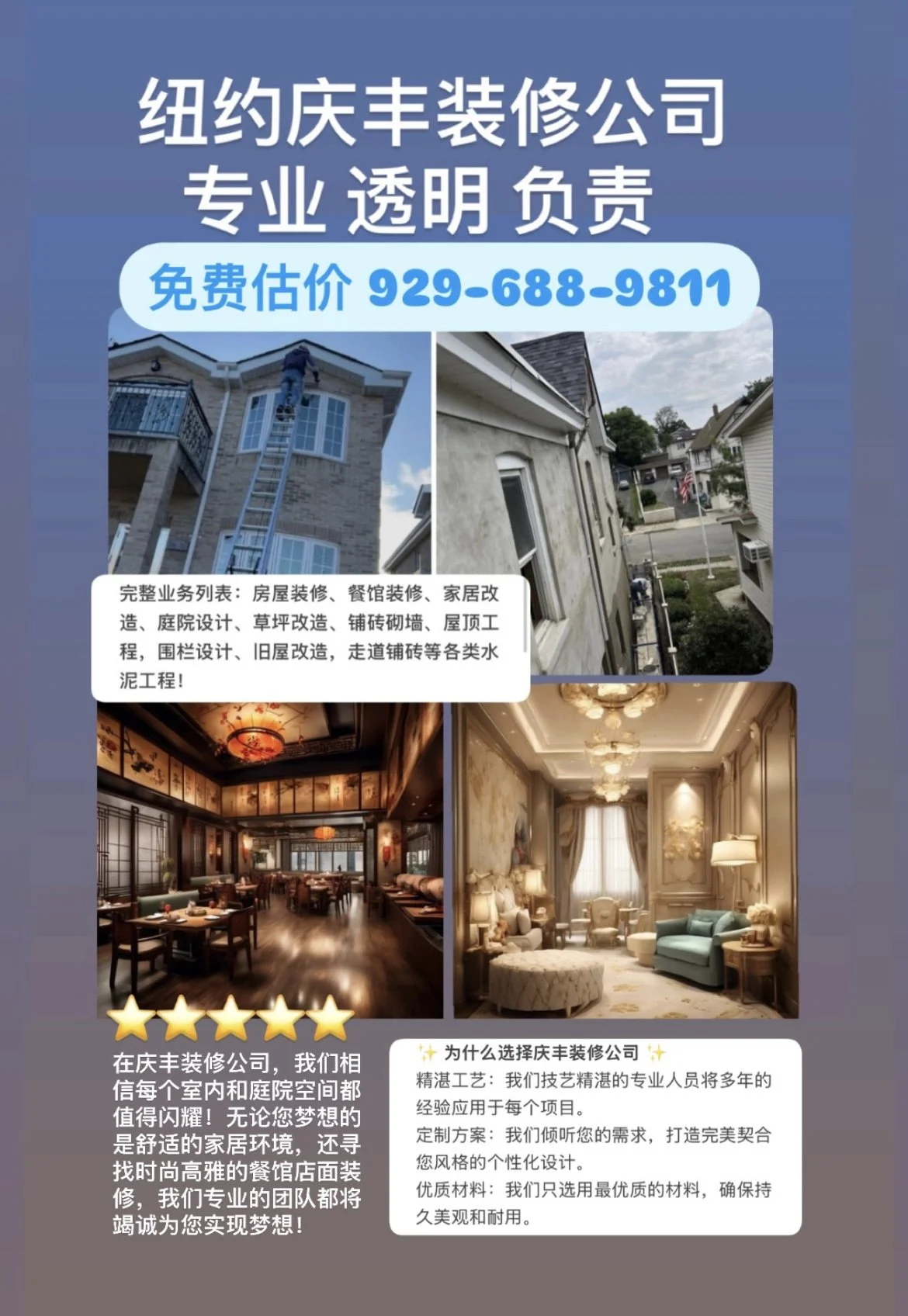 纽约华人装修 纽约华人水电公司;上州华人装修 上州华人水电公司;新泽西华人装修 新泽西华人水电公司;美国可信赖的华人装修公司:庆丰装修公司!现在就拨打电话免费估价:929-688-9811(老董专业团队服务地区:大纽约州,上州,新泽西州)